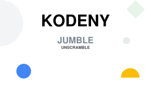 K O D E N Y Jumble. The jumbled letters appeared in the daily jumble puzzle and you have to guess the correct answer word, that is made up by all these letters. As you may imagine, different words are made of out same set of letters, in such cases we include both words or the most likely one. It is also possible that the same answer word appears by a different set of letters which are ordered differently.
